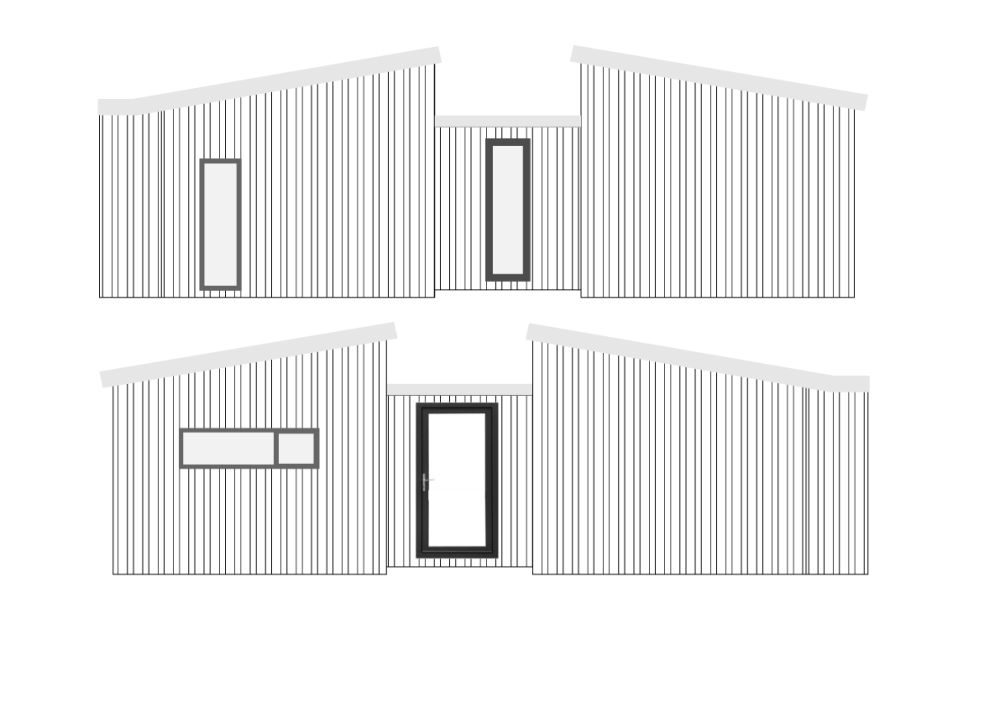 Our original design can be developed in a modular fashion to give different living spaces. The Tiny House version below gives you living space of just under 50 sq m split into living and bedroom blocks linked by a corridor that doubles as a sheltered entrance hall, giving you space for coats and boots etc.
